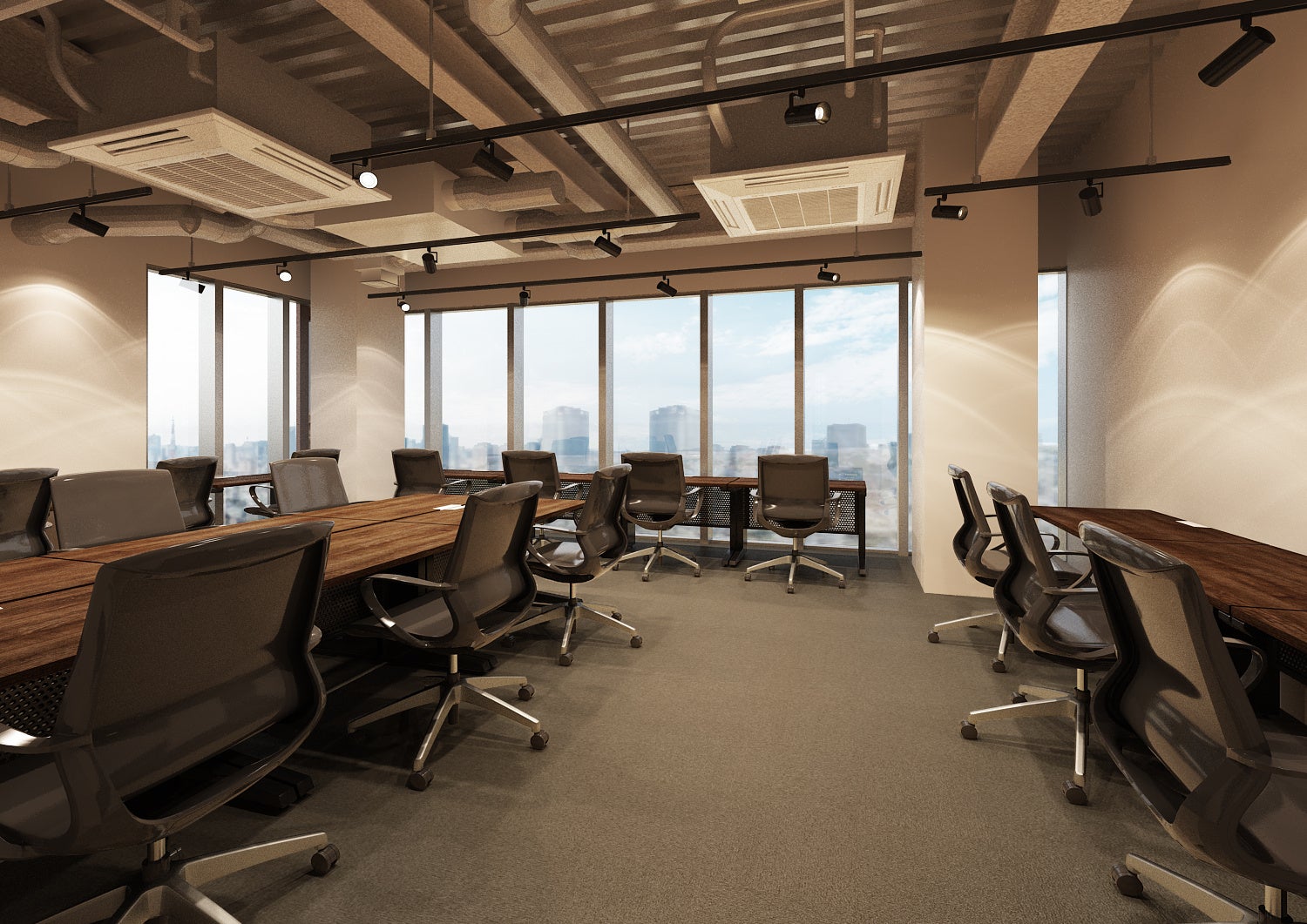 フレキシブルオフィス入居者が日常的かつ自由に利用可能なスペース。ラウンジは、全体またはエリアごとの貸切りにも対応しており、入居者は大人数での懇親会やイベントなどの用途で利用可能です。テラスは、4階から屋上までつながる吹き抜け直下にあり、北谷公園にも視線が抜ける、開放感のある空間です。なお、ラウンジとテラスの間にある可動間仕切りを開くことで一体的に利用することが可能です。