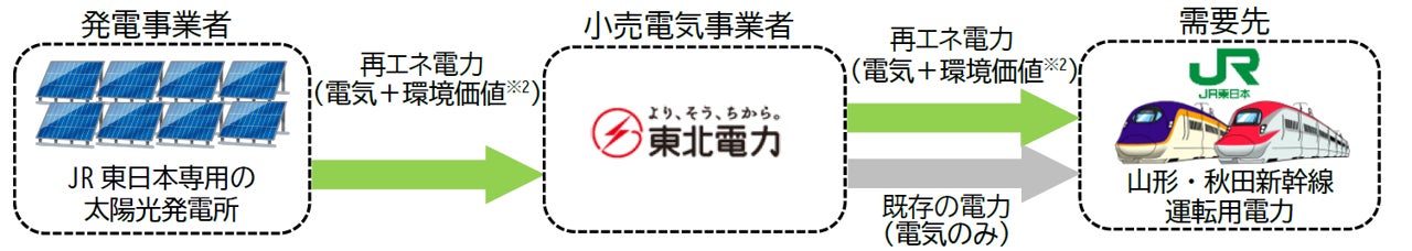 JR東日本専用の太陽光発電所で発電した再エネ電力を、東北電力が一般送配電事業者の送配電ネットワークを経由して山形・秋田新幹線の運転用変電所に供給します。