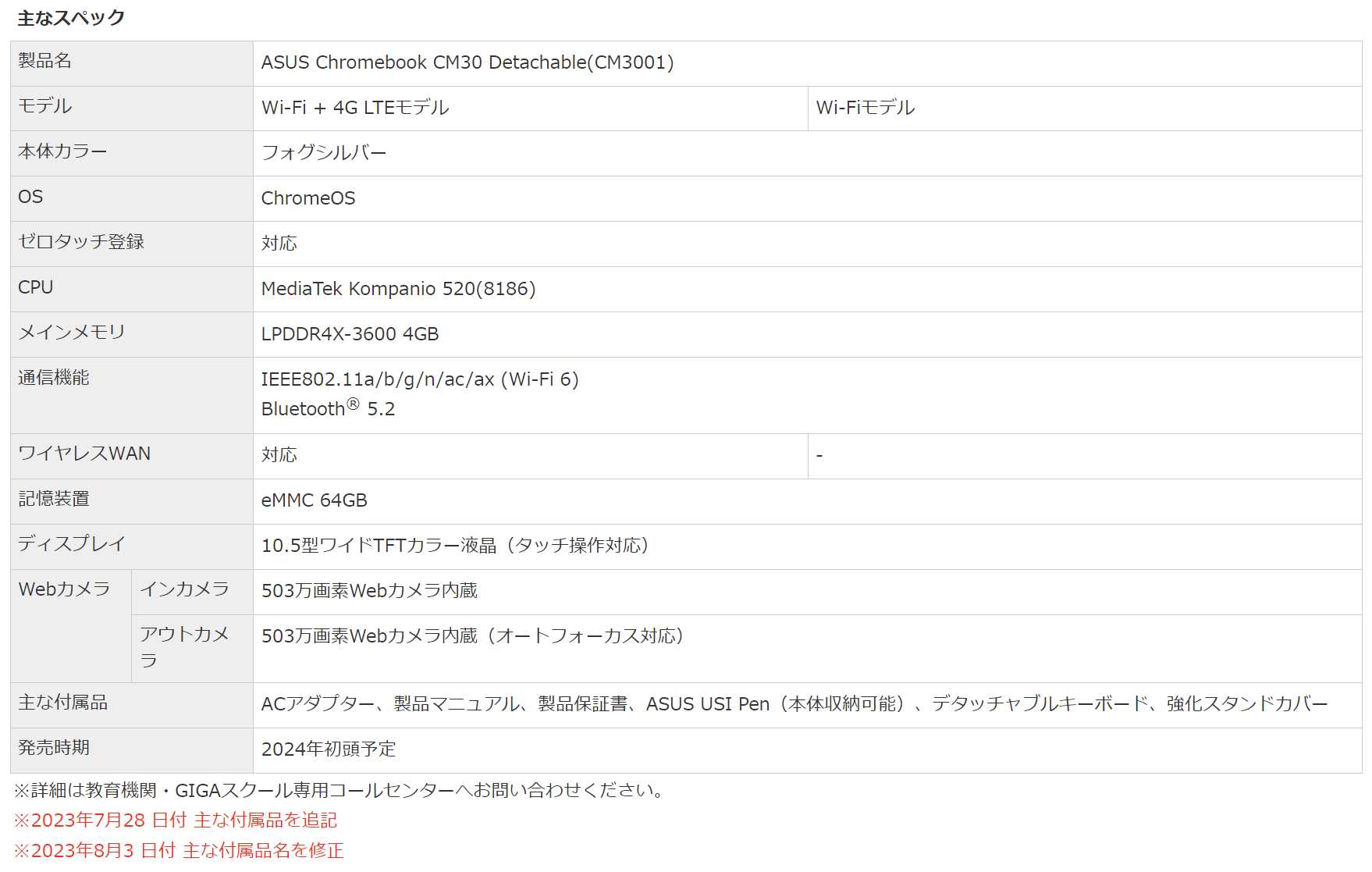 ASUS JAPAN株式会社は本日、教育機関・GIGAスクール向けChromebookシリーズより「ASUS Chromebook CM30 Detachable(CM3001)」(以下、CM3001)の計1製品2モデルを発表しました。CM3001は堅牢さと持ち運びやすさを兼ね備えた、通学に適した2-in-1 ノートPCです。10.5型のタッチパネルディスプレイ、脱着可能なキーボード、強化スタンドカバー、本体収納が可能なスタイラスペンが一台に収まっているので、用途に合わせて多様なスタイルでご使用いただけます。キーボードを取り外してタブレットスタイルで使用したり、スタイラスペンでメモを書き留めたりすることができるため、グループワークや自宅学習など多種多様な学習環境に合わせて柔軟に使用することができます。今回発表したモデルのうち1つは4G LTEに対応し、Wi-Fi環境を気にすることなく高速モバイル通信が可能です。本製品の発売日や価格などの詳細については、教育機関・GIGAスクール専用コールセンターまでお問い合わせください。