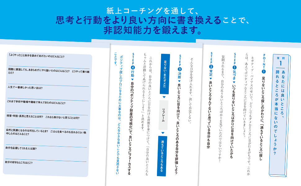 さまざまな質問に1つずつ答えながら、ワークを進めていくことで、思考と行動がポジティブに書き換えられ、非認知能力が鍛えられていきます。