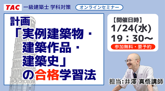【TAC建築士】オンラインセミナー開催 一級建築士(学科)計画「実例建築物・建築作品・建築史」の合格学習法