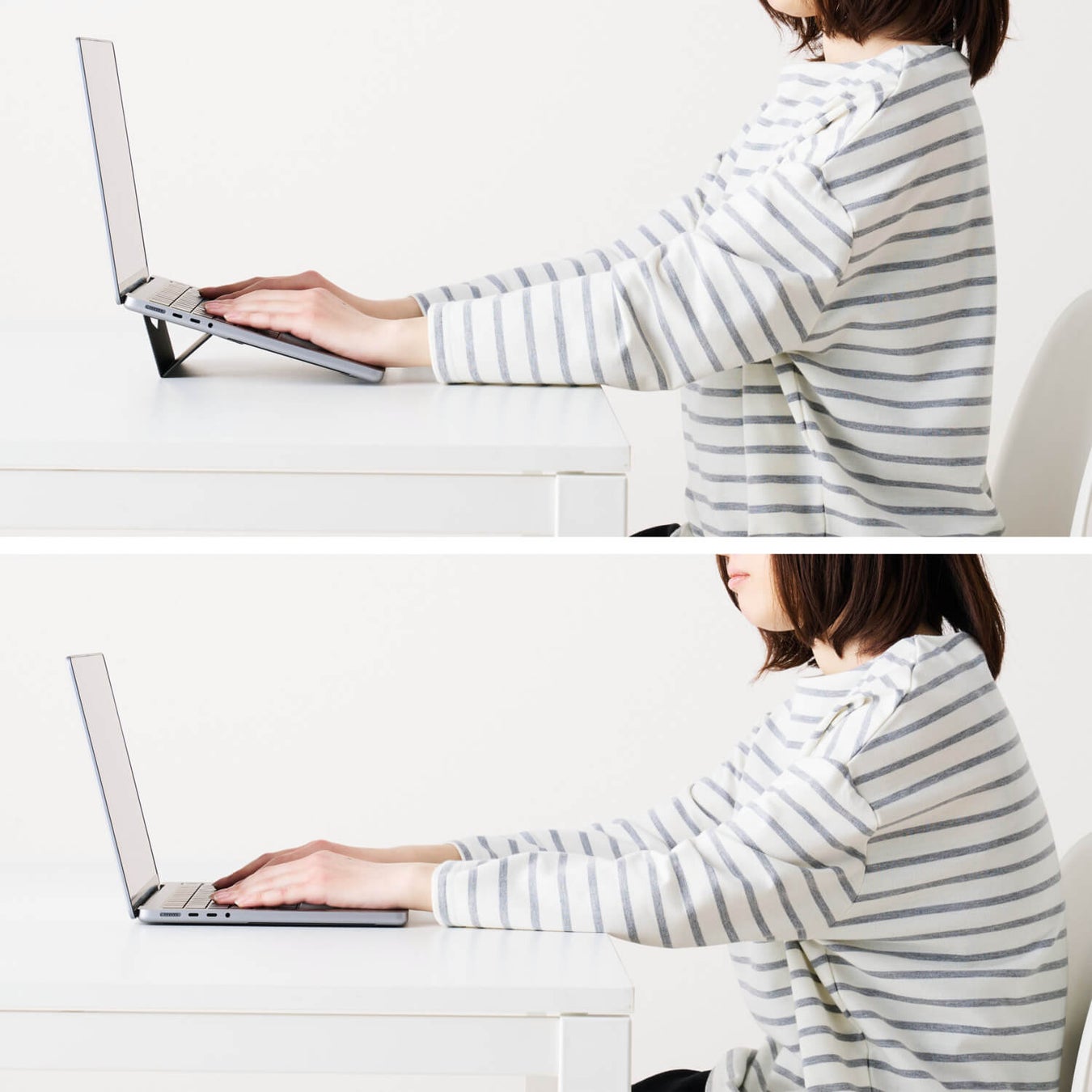 ノートパソコンの画面部分を約5cm持ち上げることで目線が上がり、パソコン操作時の姿勢を改善できます。
