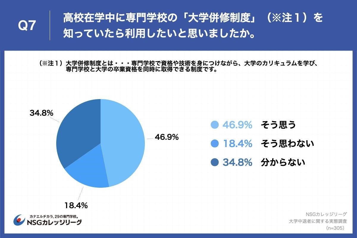 「Q7.高校在学中に専門学校の「大学併修制度」(※注1)を知っていたら利用したいと思いましたか。」(n=305)と質問したところ、「そう思う」が46.8%、「そう思わない」が18.4%という回答となりました。