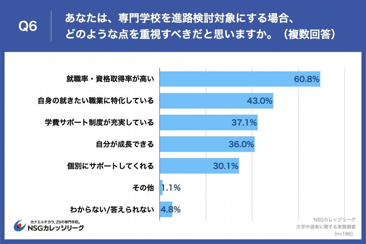 Q4で「そう思う」「元々検討対象に入れていた」と回答した方に、「Q6.あなたは、専門学校を進路検討対象にする場合、どのような点を重視すべきだと思いますか。(複数回答)」(n=186)と質問したところ、「就職率・資格取得率が高い」が60.8%、「自身の就きたい職業に特化している」が43.0%、「学費サポート制度が充実している」が37.1%という回答となりました。