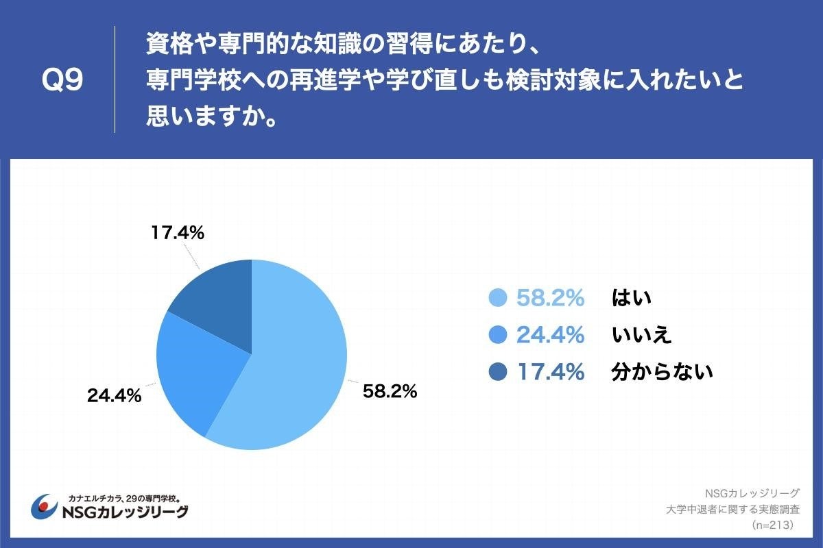Q8で「はい」と回答した方に、「Q9.資格や専門的な知識の習得にあたり、専門学校への再進学や学び直しも検討対象に入れたいと思いますか。」(n=213)と質問したところ、「はい」が58.2%、「いいえ」が24.4%という回答となりました。
