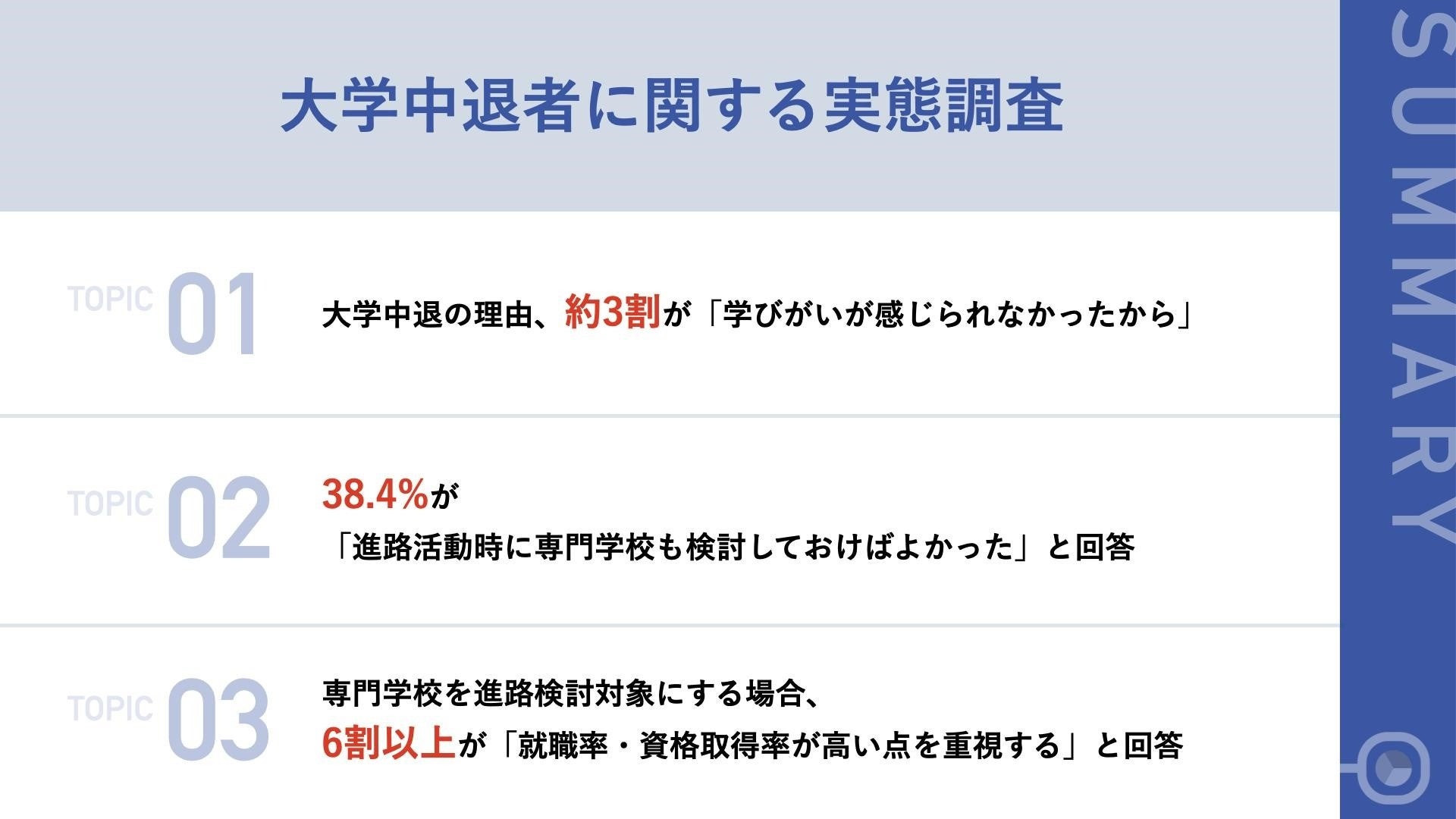 大学中退理由、3割以上が「学びがいが感じられなかった」38.4%が「進路活動時に専門学校も検討しておけばよかった」と回答