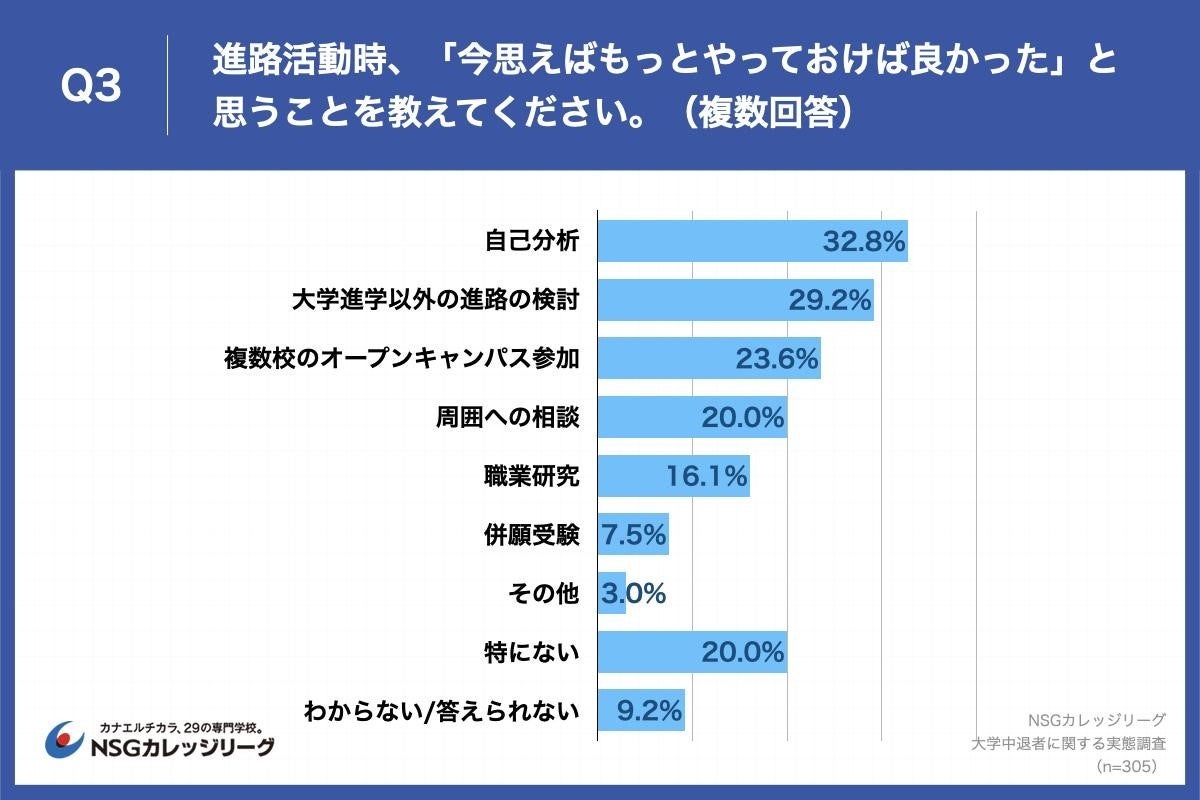 「Q3.進路活動時、「今思えばもっとやっておけば良かった」と思うことを教えてください。(複数回答)」(n=305)と質問したところ、「自己分析」が32.8%、「大学進学以外の進路の検討」が29.2%、「複数校のオープンキャンパス参加」が23.6%という回答となりました。