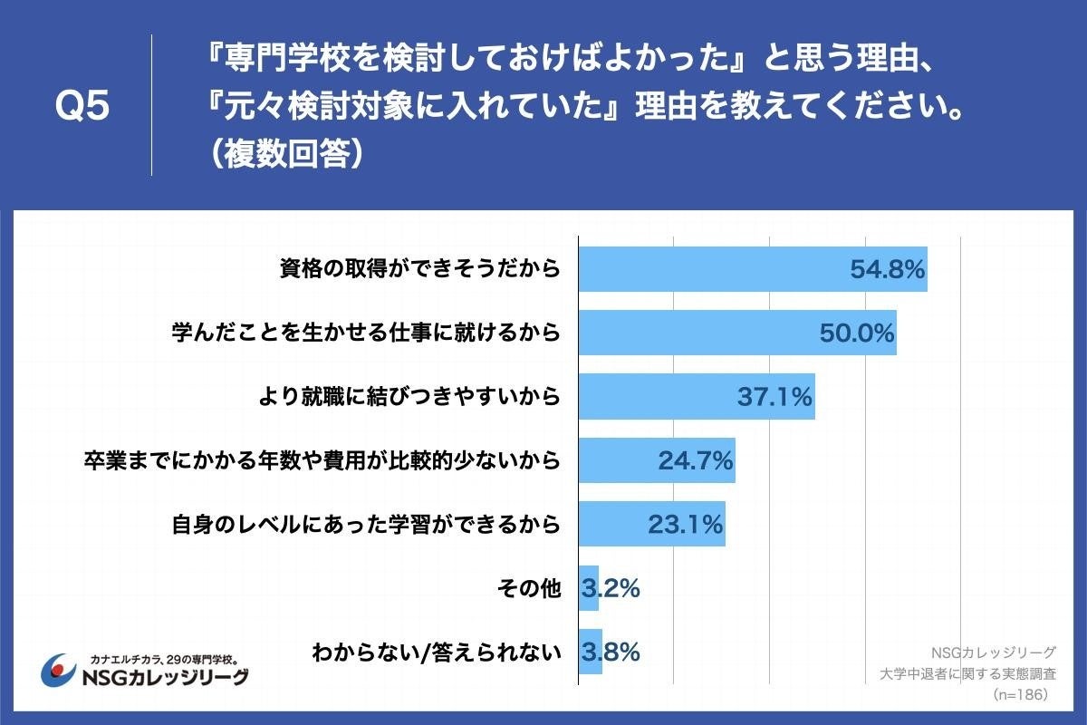 Q4で「そう思う」「元々検討対象に入れていた」と回答した方に、「Q5.『専門学校を検討しておけばよかった』と思う理由、『元々検討対象に入れていた』理由を教えてください。(複数回答)」(n=186)と質問したところ、「資格の取得ができそうだから」が54.8%、「学んだことを生かせる仕事に就けるから」が50.0%、「より就職に結びつきやすいから」が37.1%という回答となりました。