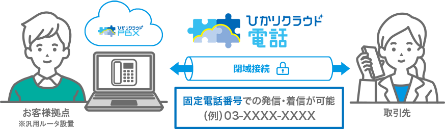 -お客さま拠点に設置した汎用ルータからひかりクラウドPBXサーバに閉域網で接続するため、インターネットのトラフィック集中による通信のゆらぎや音声品質の劣化を防ぐことが可能です。※3 ※4