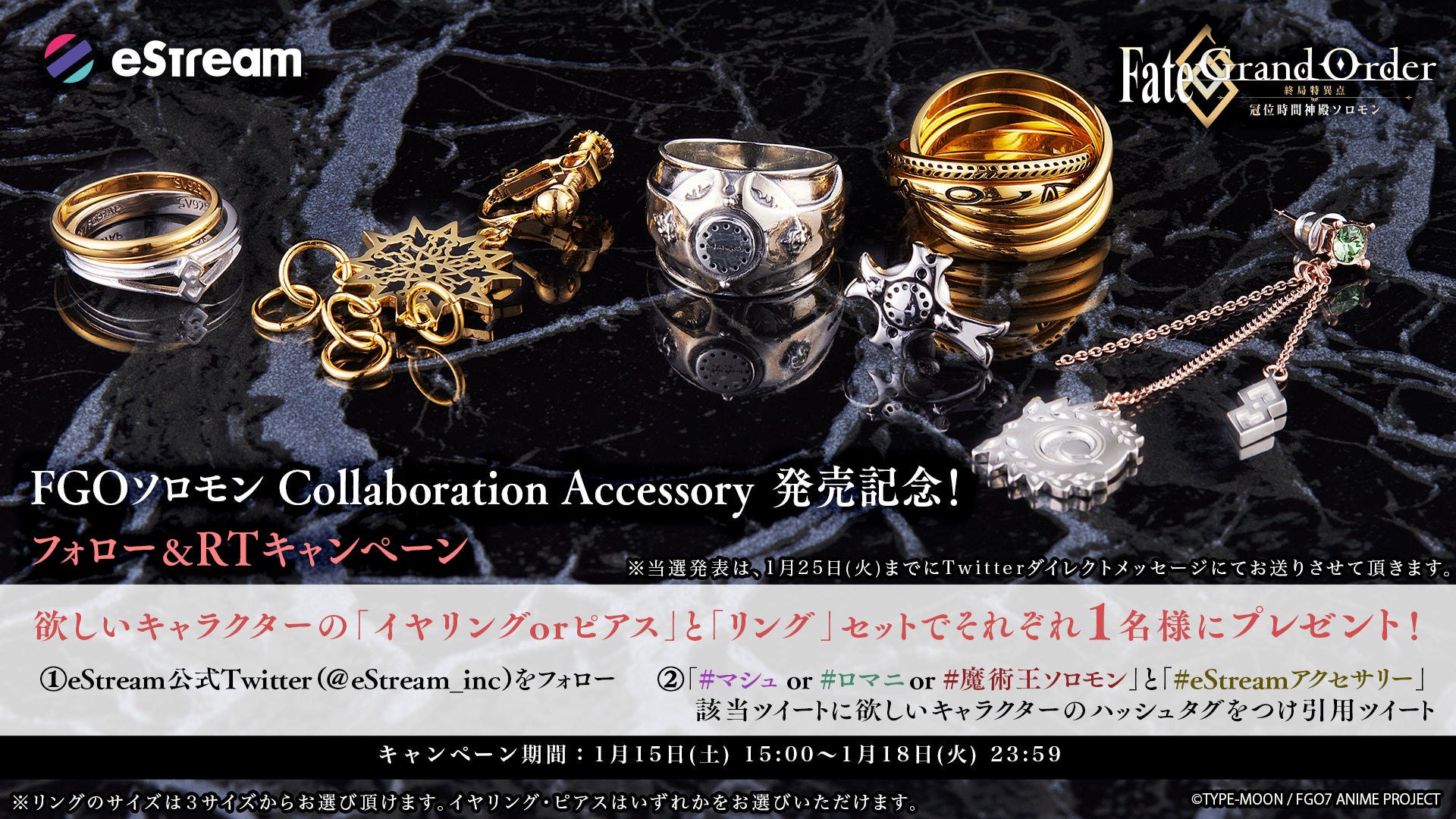 株式会社CyberZ(本社:東京都渋谷区、代表取締役社長:山内隆裕)の連結子会社、株式会社eStream(本社:東京都渋谷区、代表取締役社長:高井里菜)は、アニメ『Fate/Grand Order -終局特異点 冠位時間神殿ソロモン-』(公式略称「FGOソロモン」)より、「マシュ・キリエライト」「ロマニ・アーキマン」「魔術王ソロモン」をモチーフにしたアクセサリーを本日1月15日(土)より予約販売開始いたしました。予約受付期間は2022年1月15日(土)15:00~2022年2月20日(日)23:59までとなっております。予約販売開始を記念してeStream公式Twitterにてフィギュアプレゼントキャンペーンを開催いたします。詳細は下記よりご確認ください。