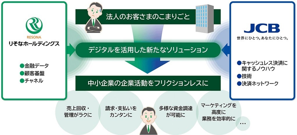 りそなグループが持つ金融データ・顧客基盤・チャネルとJCBが持つキャッシュレス決済に関するノウハウ・技術・決済ネットワークを掛け合わせて、決済を起点とした法人分野における新たなソリューションを共同で検討・開発し、中小企業のお客さまの生産性の向上に貢献します。