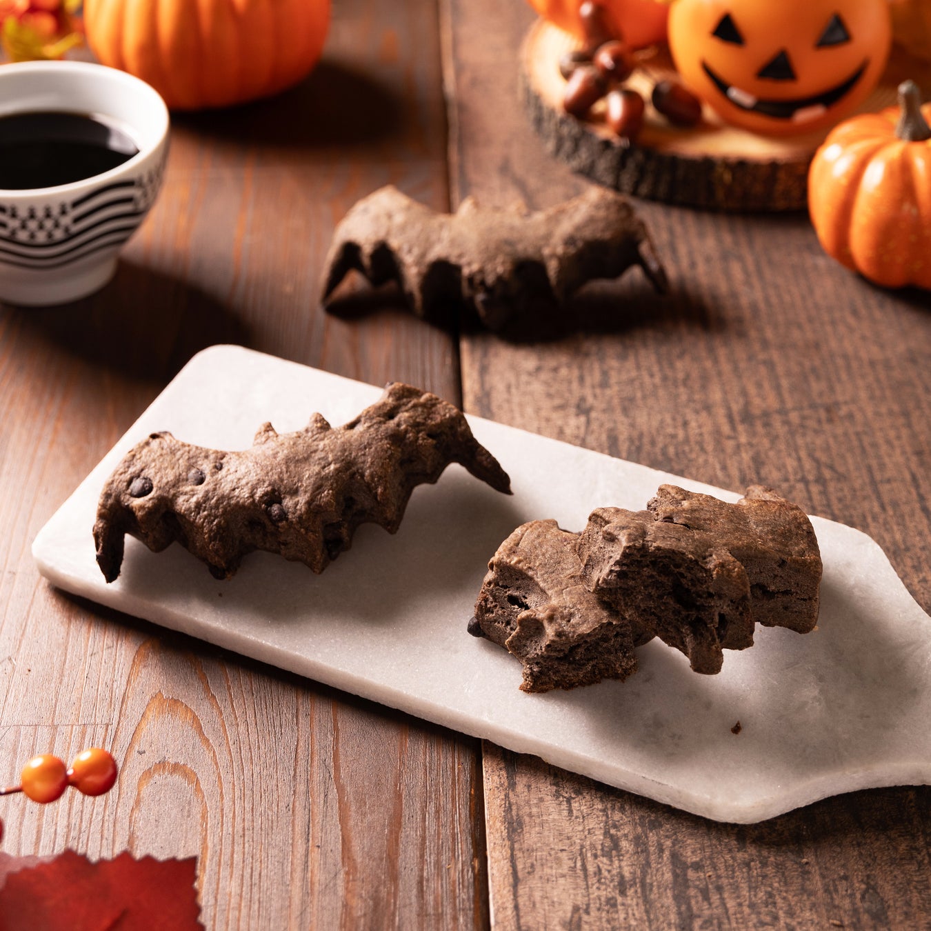 ブラックココアとチョコチップを混ぜ込んだ、ほんのりビターなスコーンをコウモリ型に焼き上げました。