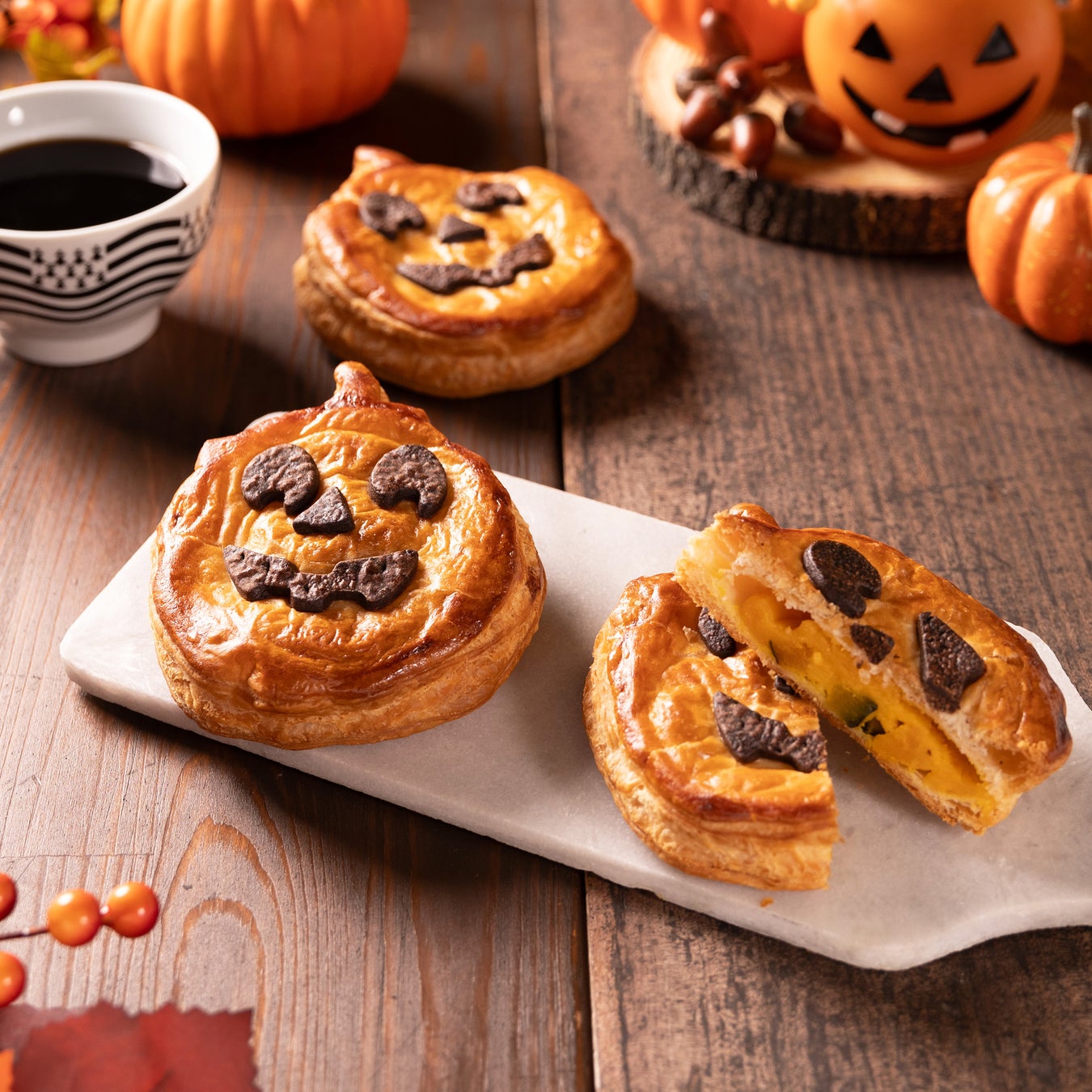 かぼちゃ型のパイに、かぼちゃクリームを包み、ビス生地でジャック・オ・ランタンの顔を描きました。