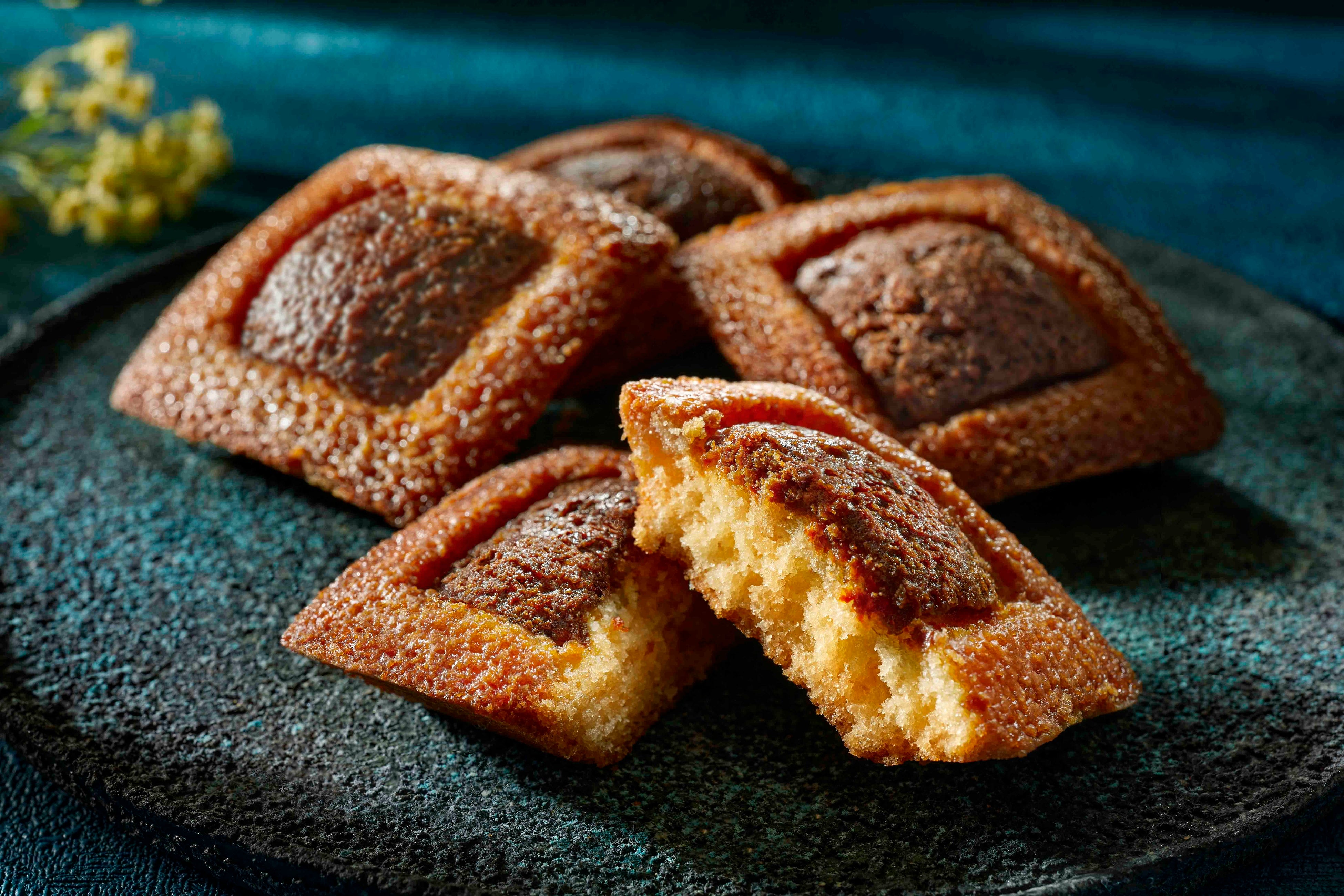 北海道発酵バターと香り高いスペイン産アーモンドを使ったバターフィナンシェ。表面を香ばしく焦がしたブリュレショコラスプレッドを埋め込んで、しっとりとジューシーに仕上げました。