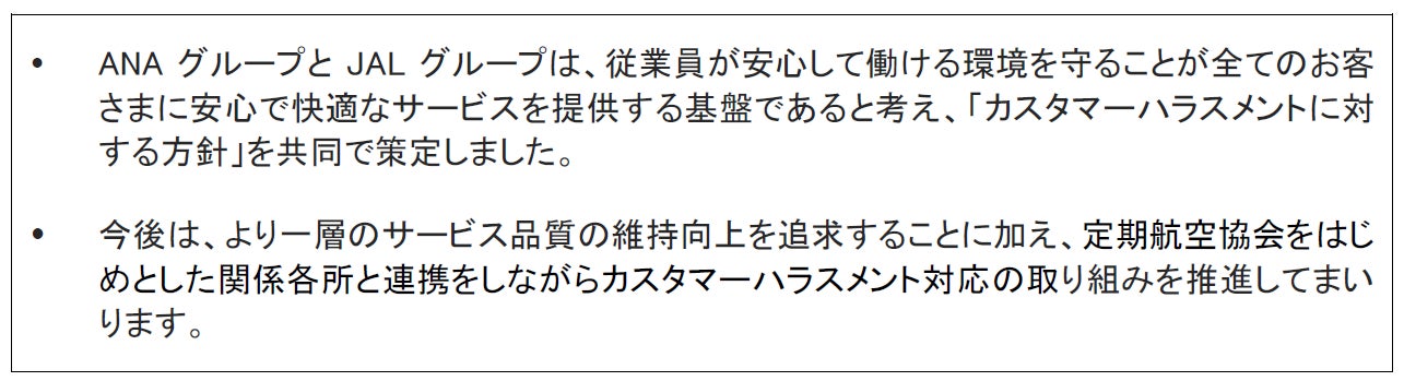 ANAグループ、JALグループは、引き続きお客さまに安心で快適な空の旅を提供できるよう、 サービス品質の向上に努めるとともに、今後は定期航空協会をはじめ、関係各所と連携をしながらカスタマーハラスメントへの取り組みを推進してまいります。