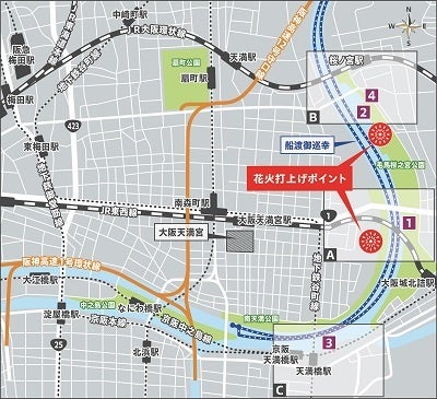 ※3 天満橋立ち見エリアは高層ビルと重なり、花火が見えづらいエリアとなります。