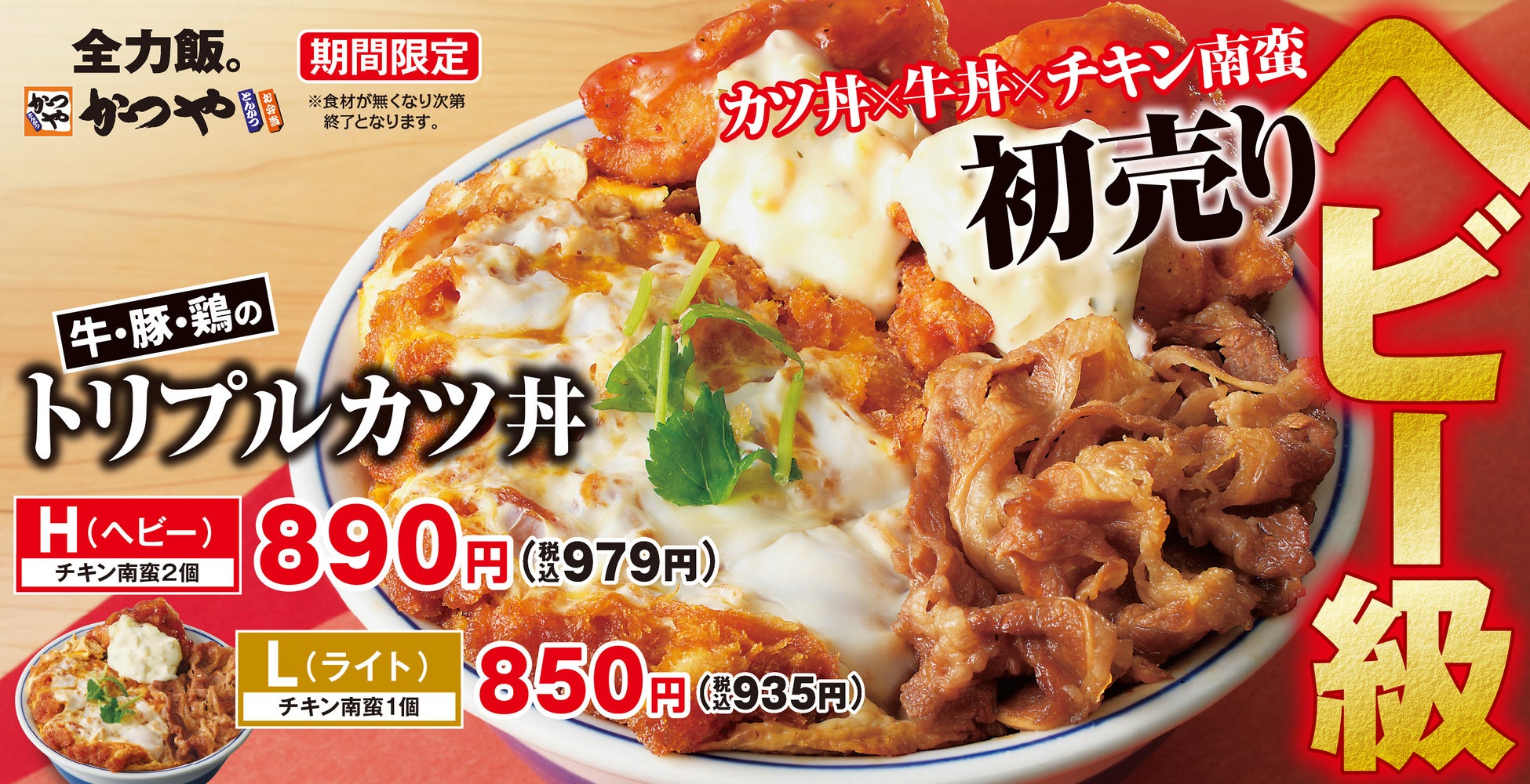 アークランドサービスホールディングス株式会社の⼦会社、とんかつ専⾨店「かつや」を展開している株式会社かつや(本社:東京都千代⽥区/代表:⼤内 勇⼀)は、国内「かつや」にて「牛・豚・鶏のトリプルカツ丼」を2025年1月10日(金)より期間限定で販売を開始いたします。