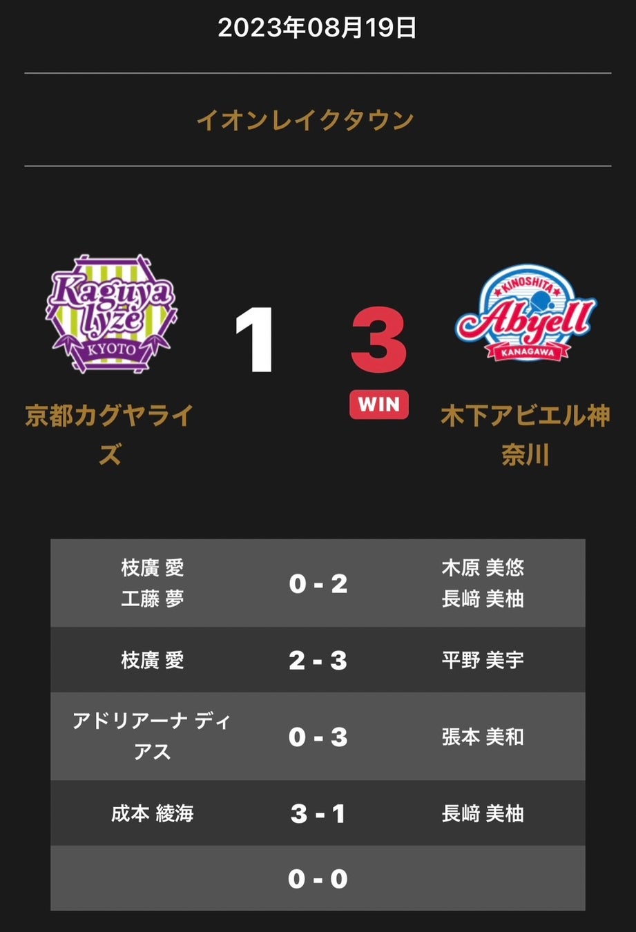 ノジマTリーグ 2023-2024シーズン 公式戦 8月19日 開催 京都カグヤライズ vs 木下アビエル神奈川 試合結果