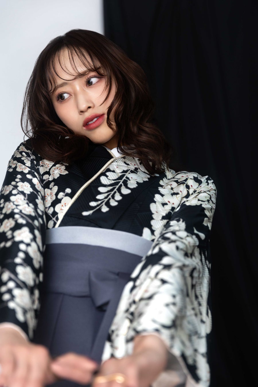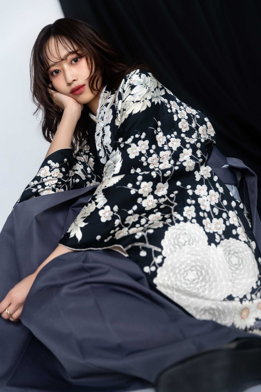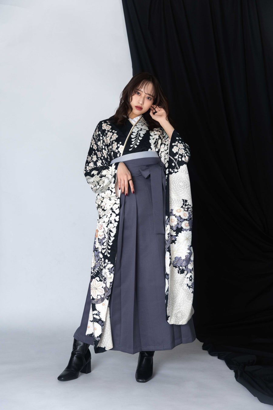 黒ベースにモノトーンな色合いのお振袖とグレーの袴を合わせて個性のあるシンプルなコーディネートに。