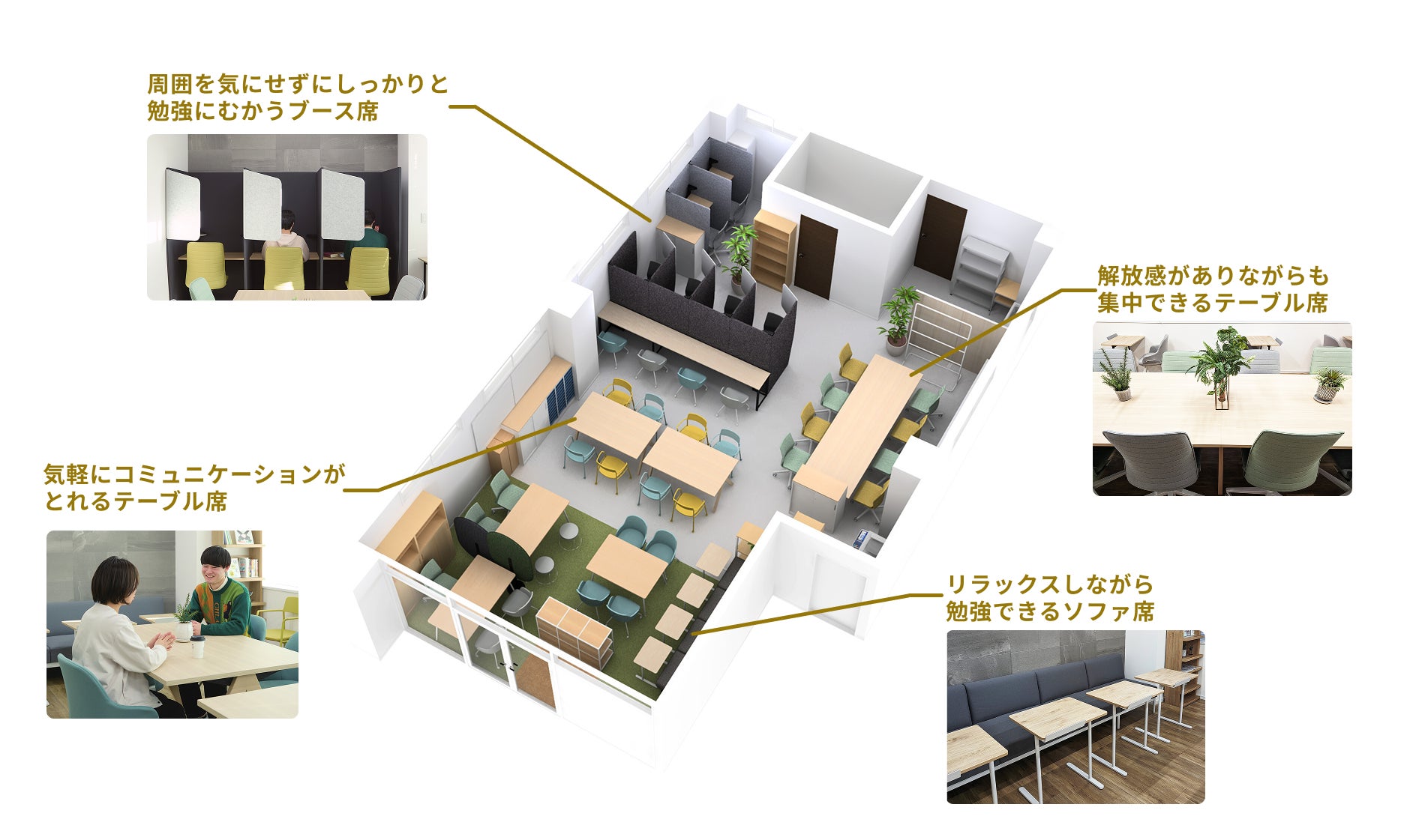 さらに、学習空間の全面リニューアルを実施し、勉強の内容に応じて使い分けられる3つのエリアを設置します。