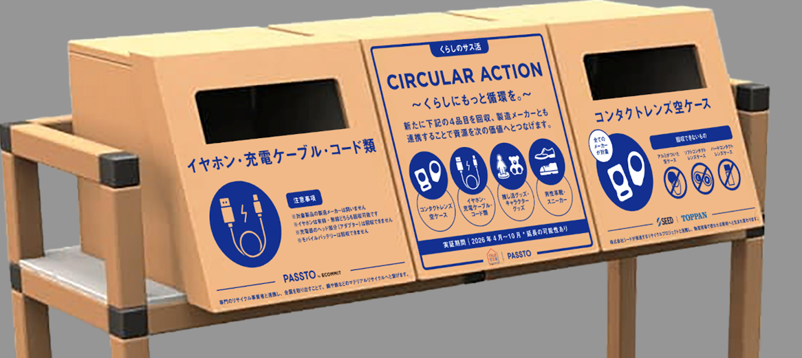 三井不動産レジデンシャル株式会社(本社:東京都中央区、代表取締役社長:嘉村 徹、以下「三井不動産レジデンシャル」)は、株式会社ECOMMIT(本社:鹿児島県薩摩川内市、代表取締役:川野 輝之、以下「ECOMMIT」)との協業により、「家電ケーブル」や「推し活グッズ」などの家庭に眠る“捨てづらいもの”の回収を新たに開始するほか、TOPPAN株式会社(本社:東京都文京区、代表取締役社長:野口 晴彦、以下「TOPPAN」)、株式会社シード(本社:東京都文京区、代表取締役社長:佐藤 隆郎、以下「シード」)とも連携することで、「コンタクトレンズケース」を回収し、資源として物流現場で使用される資材へと再利用する実証に取り組みます。