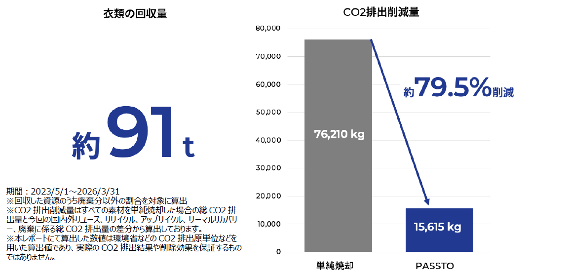 3.2023年5月の本運用開始から、約91tの衣類回収。単純焼却と比較して79.5%のCO2を削減