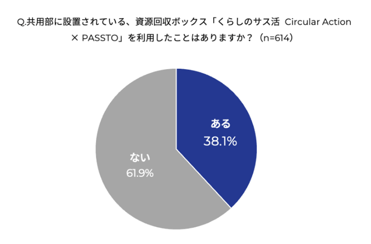 三井不動産レジデンシャルが推進する「くらしのサス活 Circular Action × PASSTO」では、マンション居住者を対象にアンケートを実施しました(回答者数:614件)。その結果、共用部に設置された資源回収ボックスの利用経験について、38.1%が「利用したことがある」と回答し、生活動線上に回収インフラを設置することで、循環行動が一定程度浸透していることが明らかになりました。