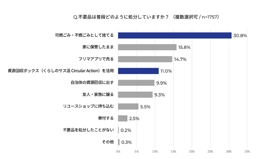 一方で、不要品の処分方法としては依然としてごみとして廃棄しているケースも多く、「捨てる」行動から「循環する」行動への転換に向けては、さらなる利便性向上が必要であることが示されました。