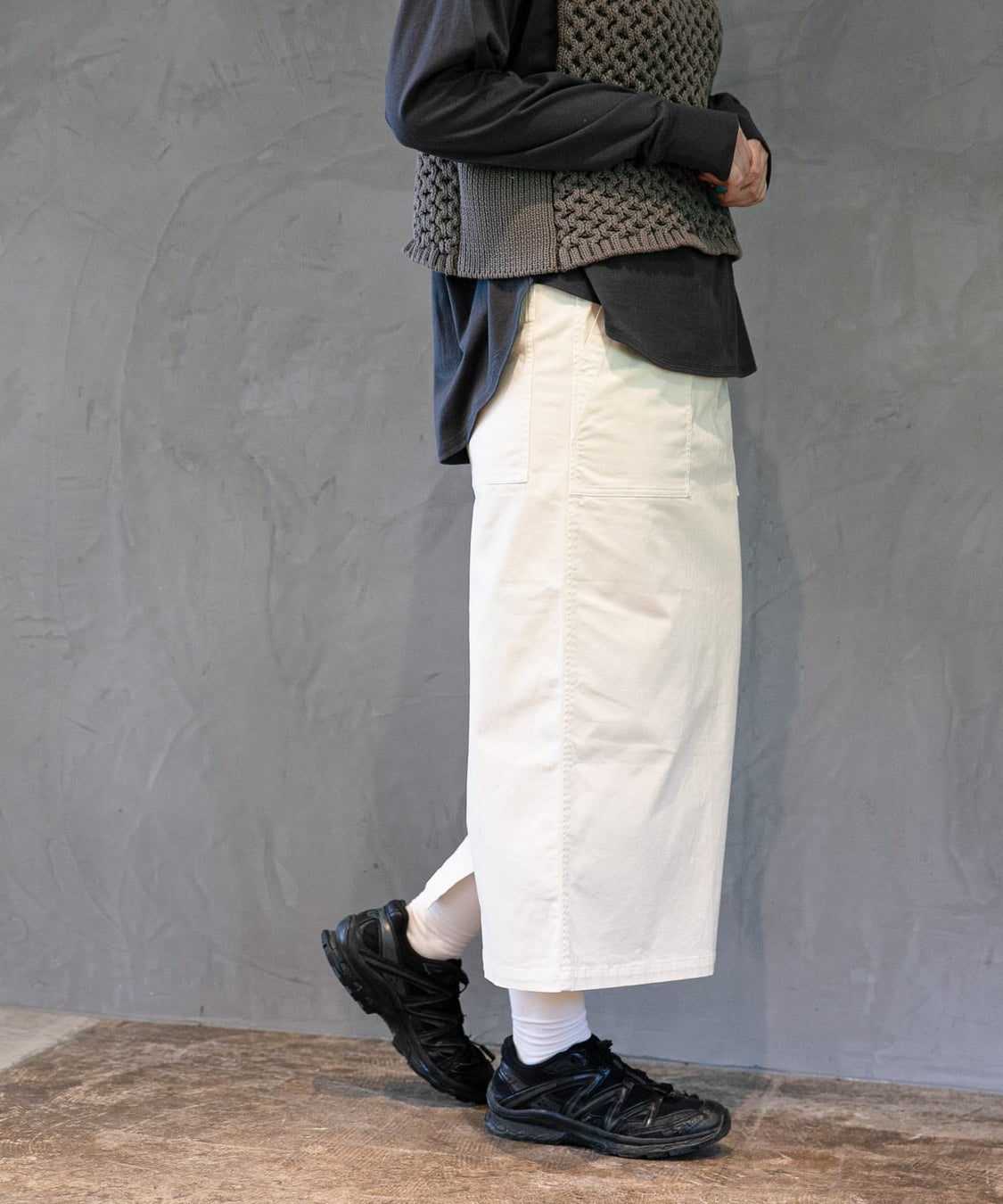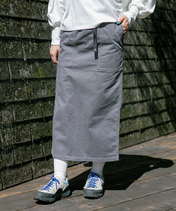 オーガニックコットンを使用したストレッチツイルを使用しています。伸縮性に優れているので着用時のストレスを軽減します。また、程よいハリ感があるので体型を拾いません。製品染めにより独特の風合いと味わい深い色合いに仕上がっています。シンプルなデザインと最適なサイズ感、丈感でスタイリングしやすく、イージーケアなのでデイリーユースに最適なスカートです。