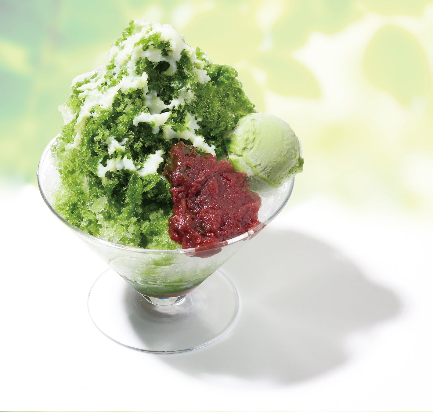 ふんわりと削ったかき氷に、ほんのり渋みのある宇治抹茶シロップをかけ、なめらか食感の抹茶アイスクリーム、優しい甘みに炊きあげた小豆あん、コンデンスミルクをトッピングしました。