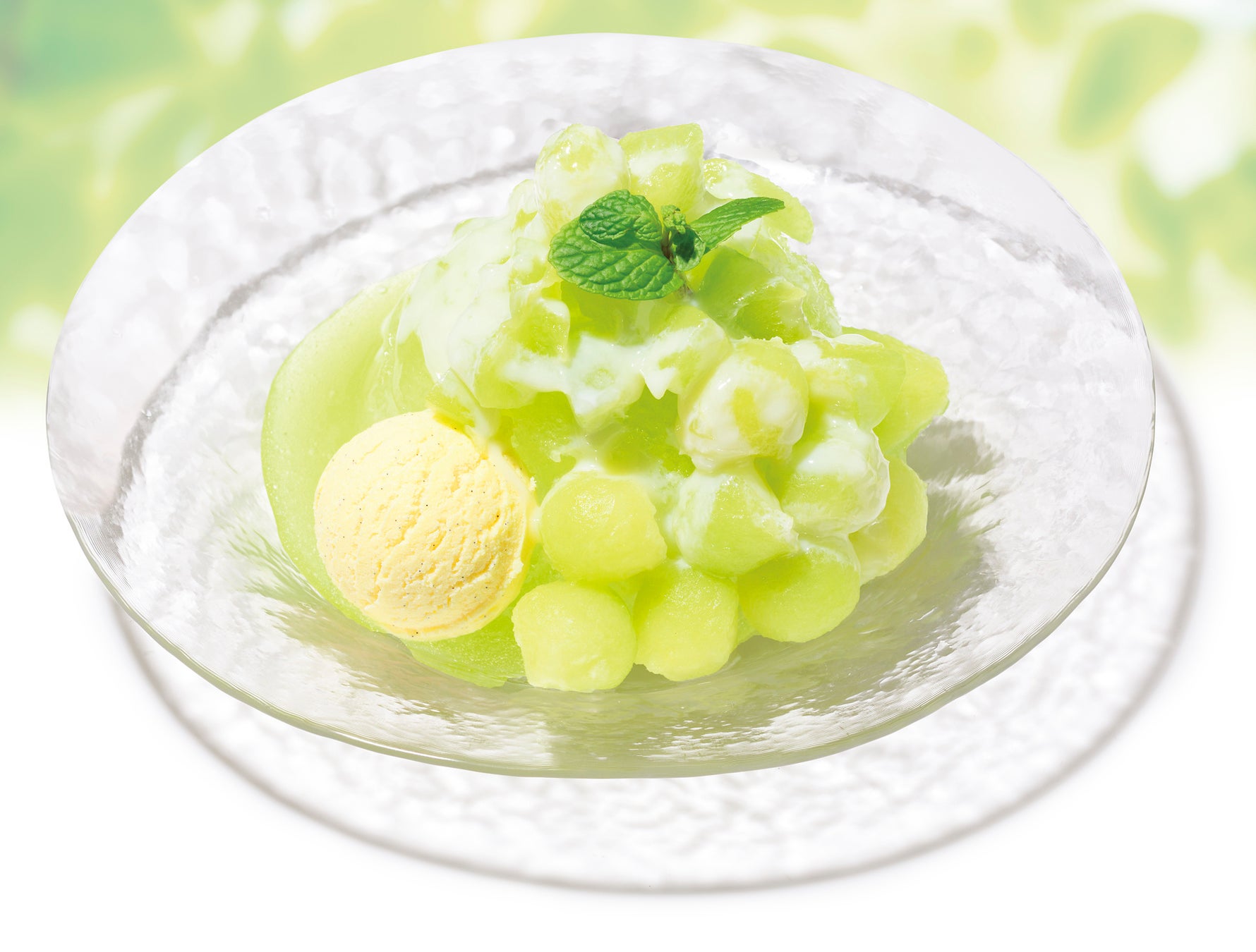 香りが高く旨みも強いメロンシロップと、丸くくりぬいたり、四角にカットした果肉の組み合わせで、メロンをダイレクトに味わえます。コンデンスミルクとバニラアイスを添えて、まろやかな味わいに仕上げました。