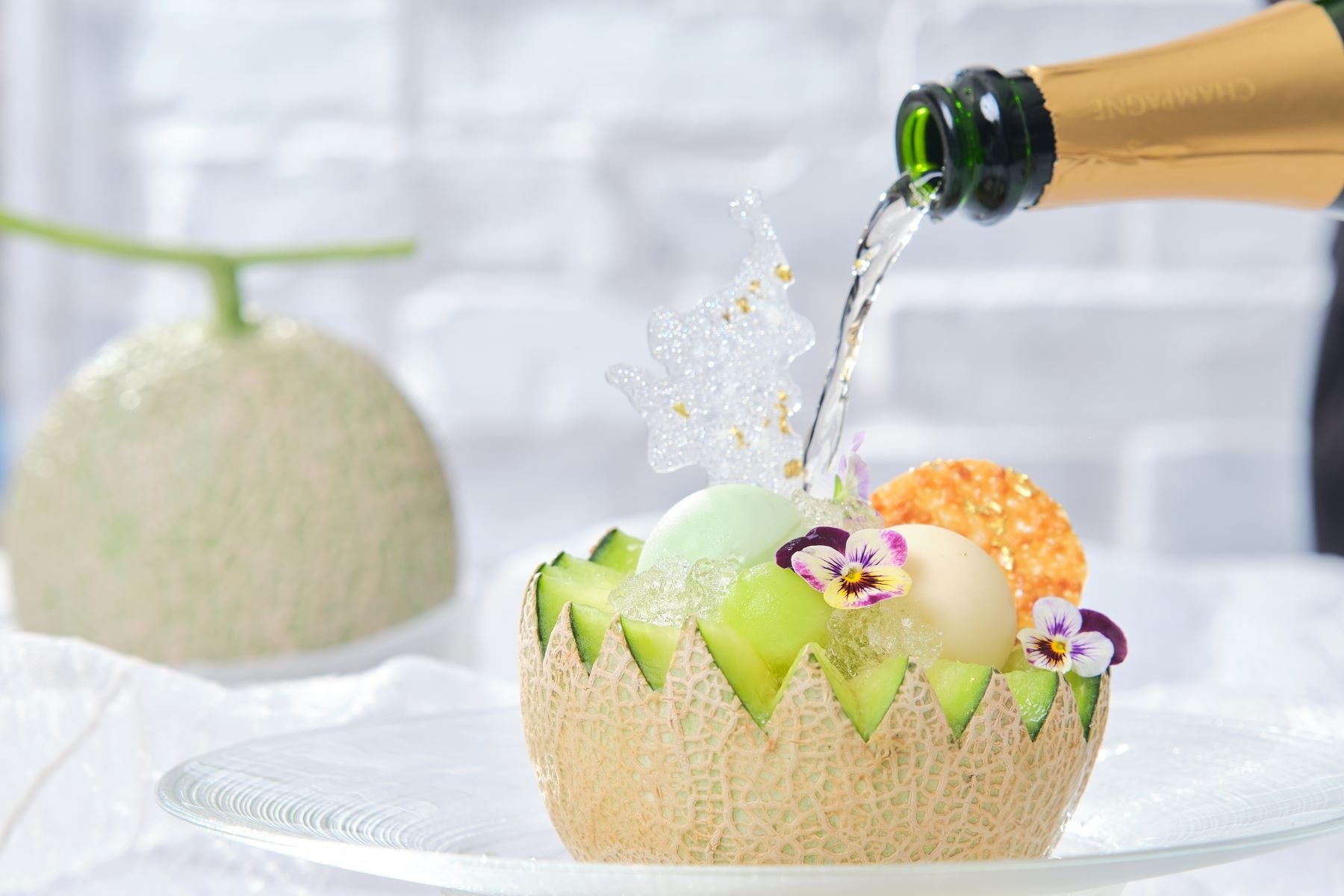 フレッシュメロンを半分に割り、くり抜いた中にメロンの果肉、メロンとヨーグルトのアイス、カスタードクリームを重ね、その上からスタッフが目の前でスパークリングワインを注ぎ完成する贅沢なメロンソーダをオプションでご用意(スパークリングワインボトル1本付き)。メッセージプレートもつけられるので、誕生日などお祝いのサプライズとしてもおすすめです。