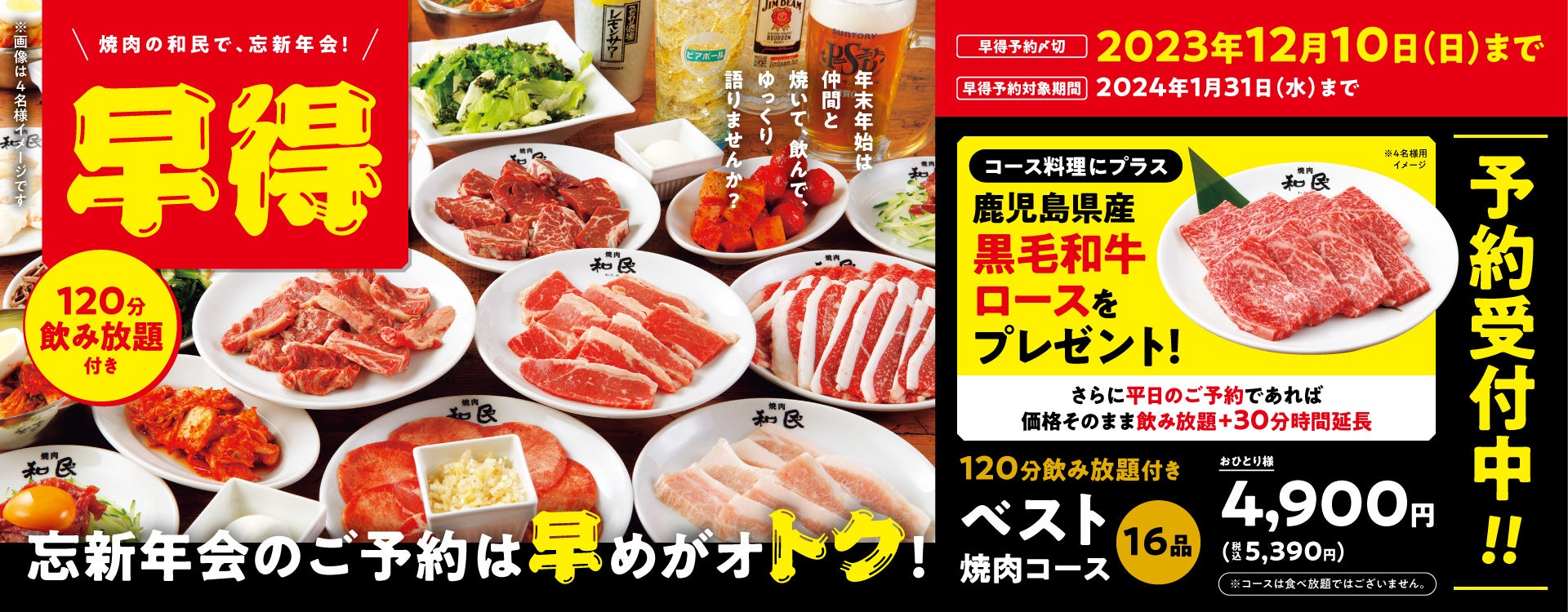 「焼肉の和民」は、パーフェクトサントリービールやハイボール、レモンサワーまで120分飲み放題付きの16品「ベスト焼肉コース」(おひとり様4,900円(税込5,390円))を、忘・新年会のシーズンとなります2024年1月31日(水)までを予約対象期間として、2023年12月10日(日)までにご予約いただくと漏れなく「黒毛和牛ロース」をプレゼントする「早得」の予約受付を開始いたします。
