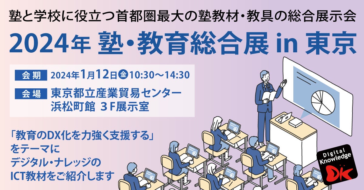 株式会社デジタル・ナレッジは、2024年1月12日(金)に開催される、塾と学校に役立つ情報展『2024年 塾・教育総合展 in 東京』に出展致します。