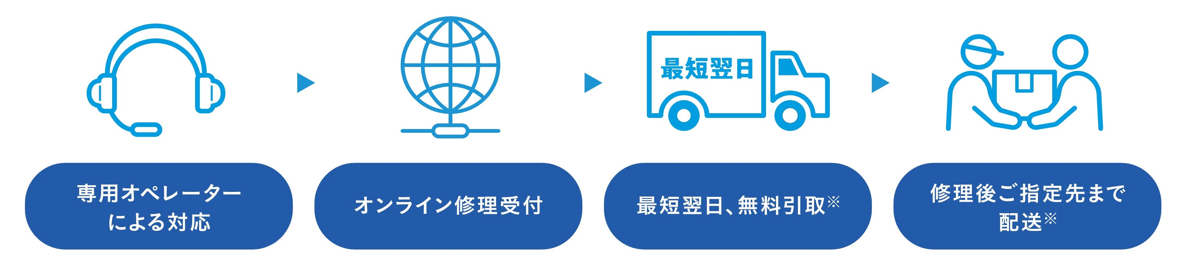万が一修理が必要になってしまった場合、オンラインで修理申し込みが可能で、「あんしん保証」または「あんしん保証プレミアム」に加入していれば、無料で指定先への製品の引き取り及び修理後の配送サービスを受けることができるため、ご自宅やオフィスにいながら、簡単に修理の手配を行うことが可能です。