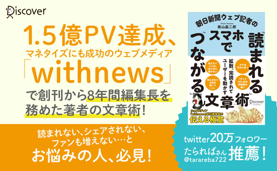 本書はそんなwithnewsを立ち上げから8年勤め、月間1億5千万PV、マネタイズも成功させた創刊編集長である奥山晶二郎氏が、「読まれる」「つながる」文章の書き方から、そのためのネタの見つけ方、言葉の選び方、書き方のポイント、ユーザーとの付き合い方などをまとめたのが本書です。