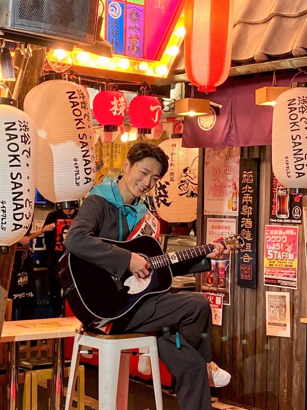 全国の横丁に歌を届けにいく予定にしていたが、コロナ禍で大使の活動は一旦中断となった。今回は、少しずつ横丁にも活気があふれる日々が戻り明るい兆しが見えてきたことから、景気付けになるようにとイベントのオファーが舞い込んだ。久しぶりの大使の仕事となった真田は、自身が大好きで想い入れのある曲として「浅草キッド」を弾き語りで情感たっぷりに披露。