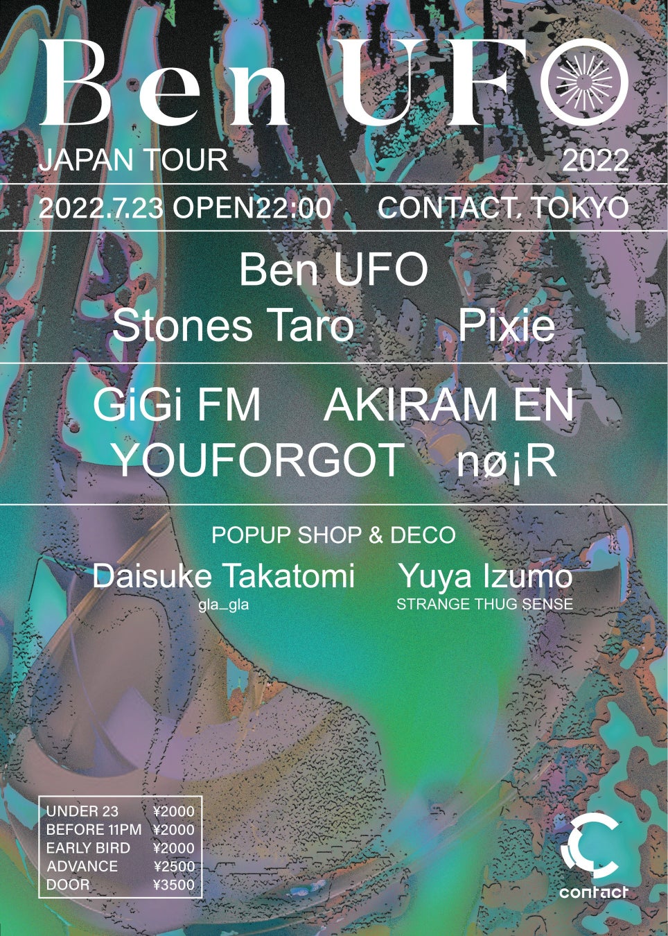 Contactの2019 - 2020のカウントダウン以来、2年半ぶりとなるBen UFO来日公演が決定。クローズまで2ヶ月を切ったContact、および全国都市圏のクラブが画策していたBen UFOの招致がジャパンツアーという形でついに成功した。