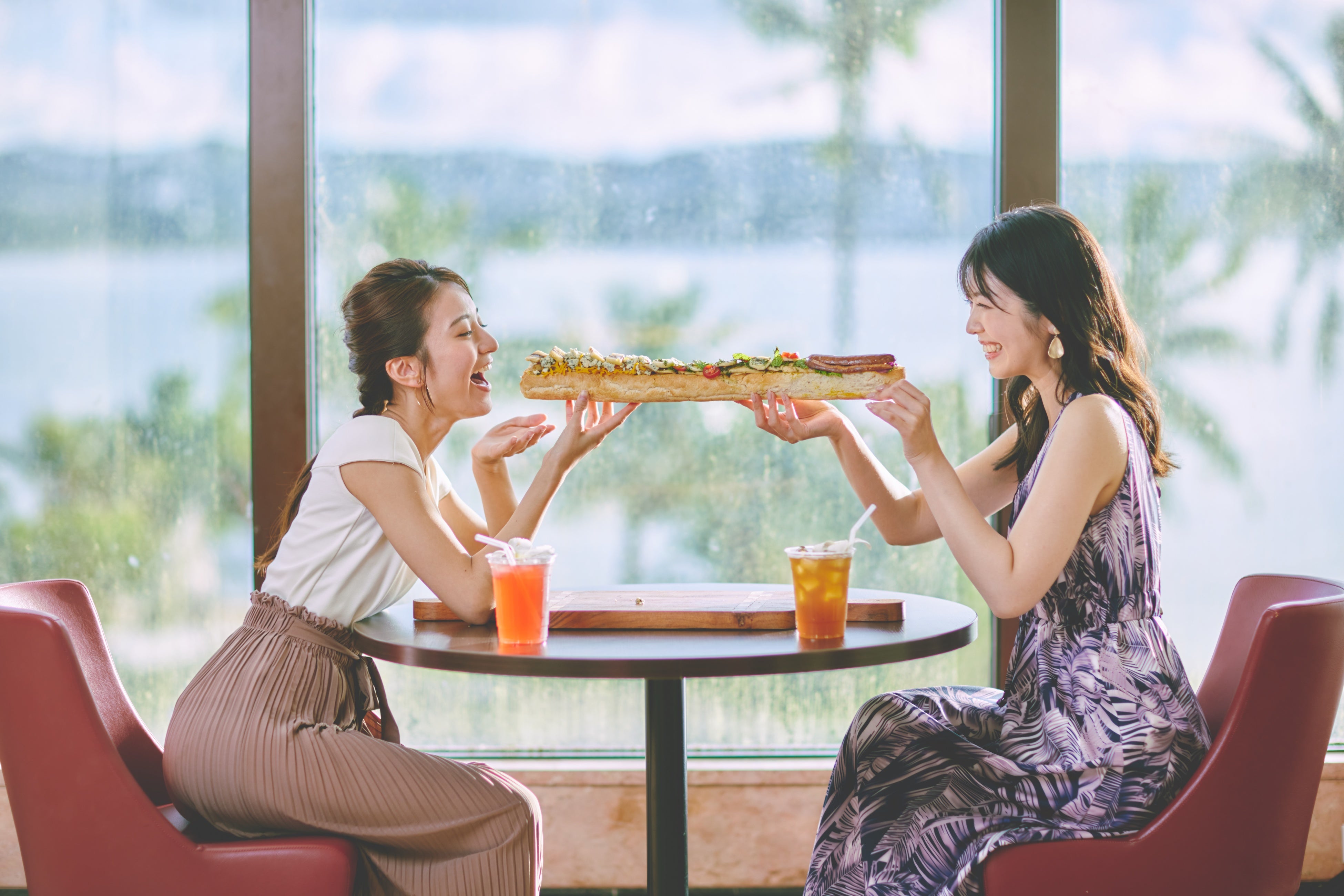 バナナは、その独特な食感と豊かな香りがチーズと非常によく合います。ミクロネシアで収穫された希少なマカウバナナと、バジル、ミントなどのハーブやブルーチーズ、島内で採取された華やかな味わいのハチミツを合わせた3種類のペアリングが楽しめる「ロングバナナバケット」を、カフェ ベイビューで提供します。このバゲットは50センチ以上あるため、数名でシェアすることができます。