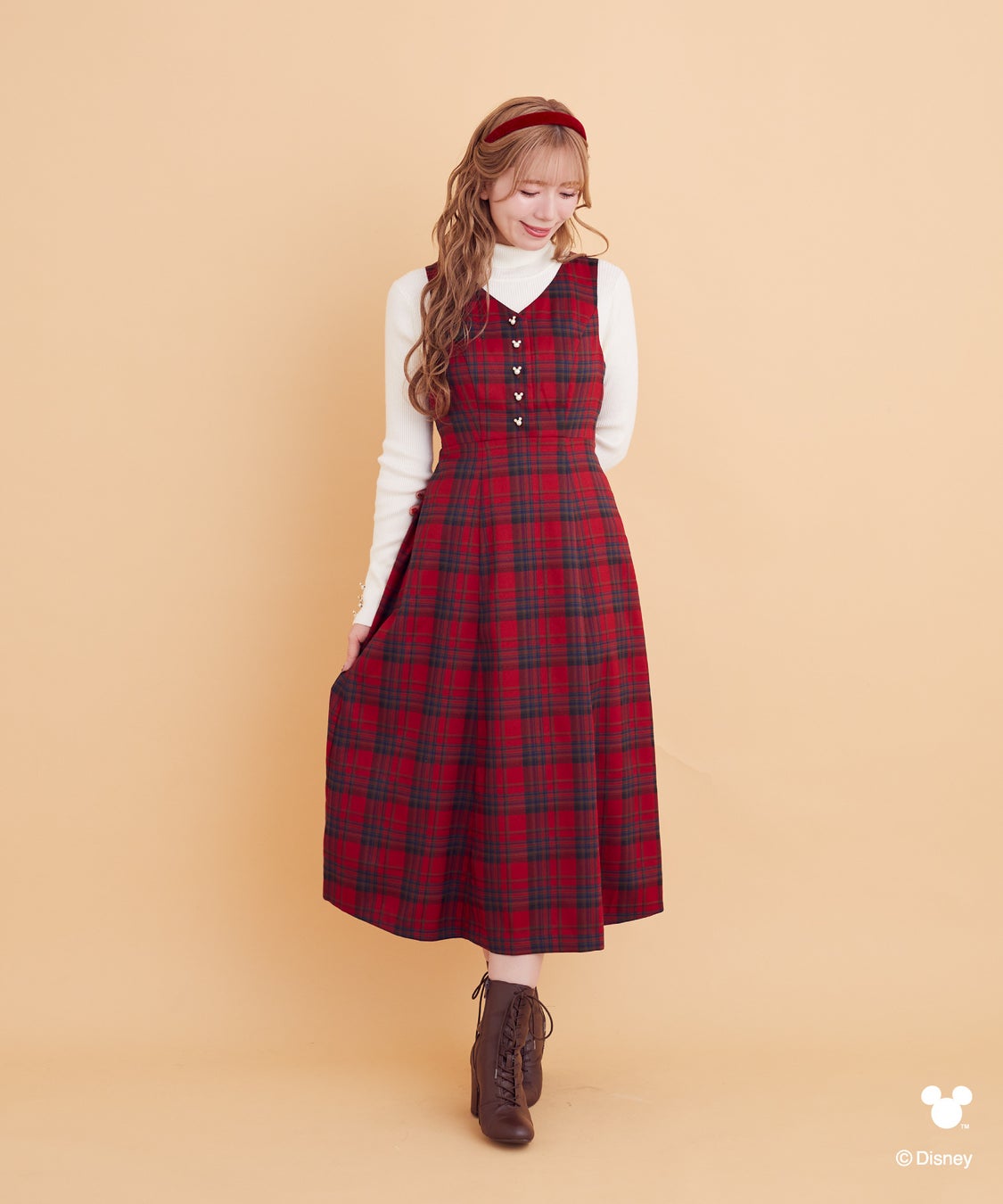 レトロなチェック柄が目を惹くジャンパースカートには、「ミッキーシェイプ」のパールボタンを施し、上品さをプラス。また、ジャンパースカートとお揃いのパールボタンを袖口に取り入れた、毎年人気のリブタートルネックニットもご用意しております。