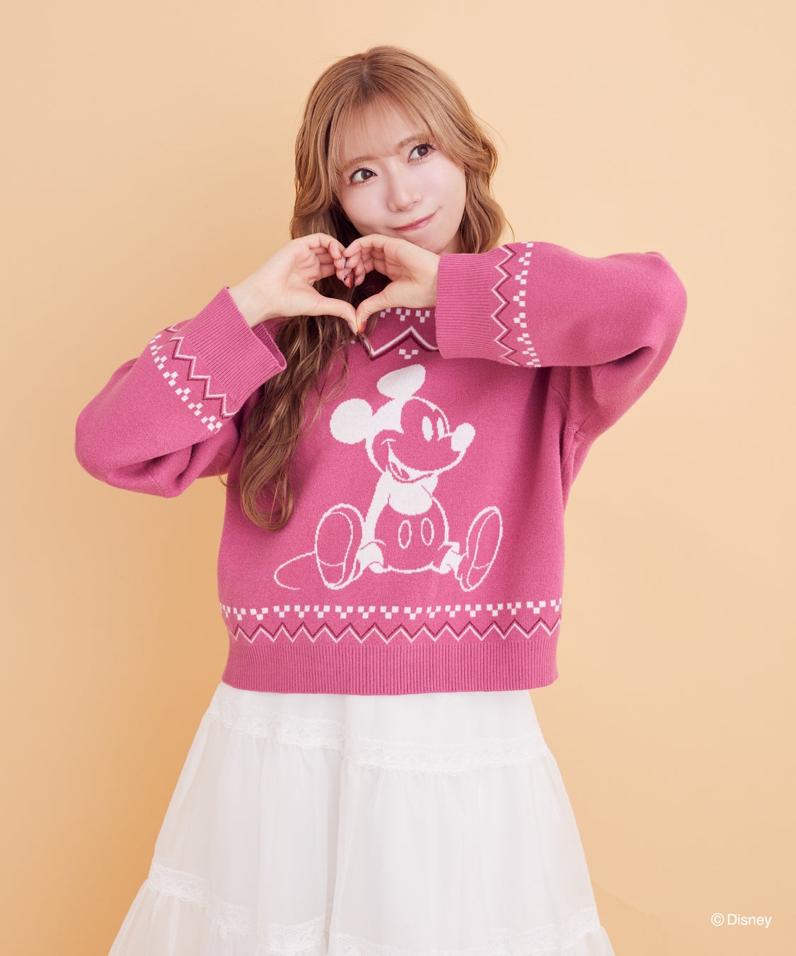 ノルディックニットプルオーバーは、ダブルジャガードで編み立てたちょこんと座る「ミッキーマウス」のアートがポイント。もちもちとした肌触りで、リラックス感のある着心地に仕上げました。