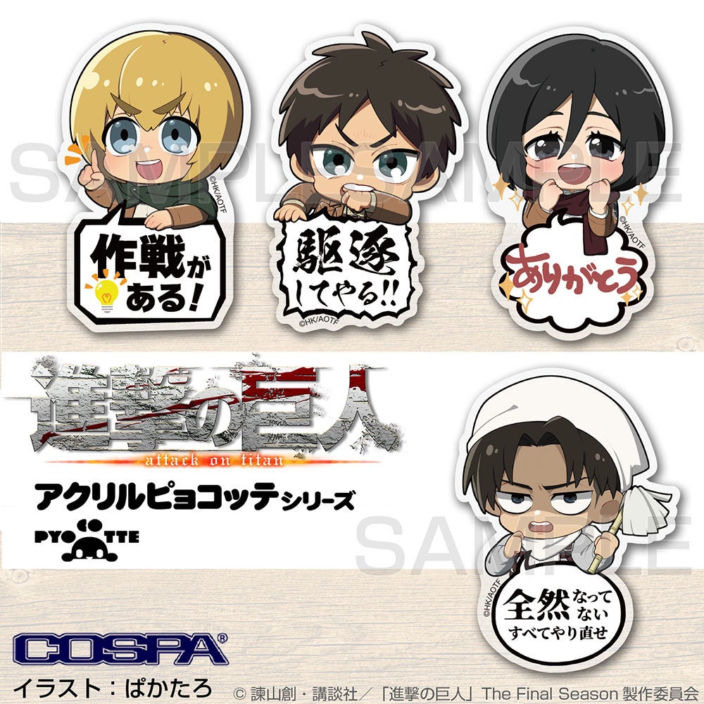 TVアニメ『進撃の巨人』より、「エレン」「ミカサ」「アルミン」「リヴァイ」のアクリルピョコッテが新登場!【株式会社コスパ】