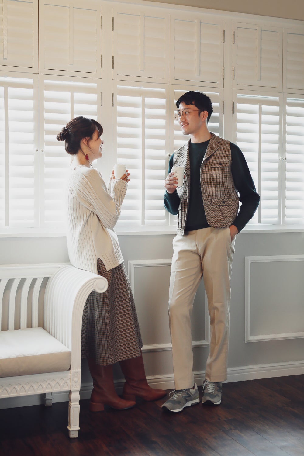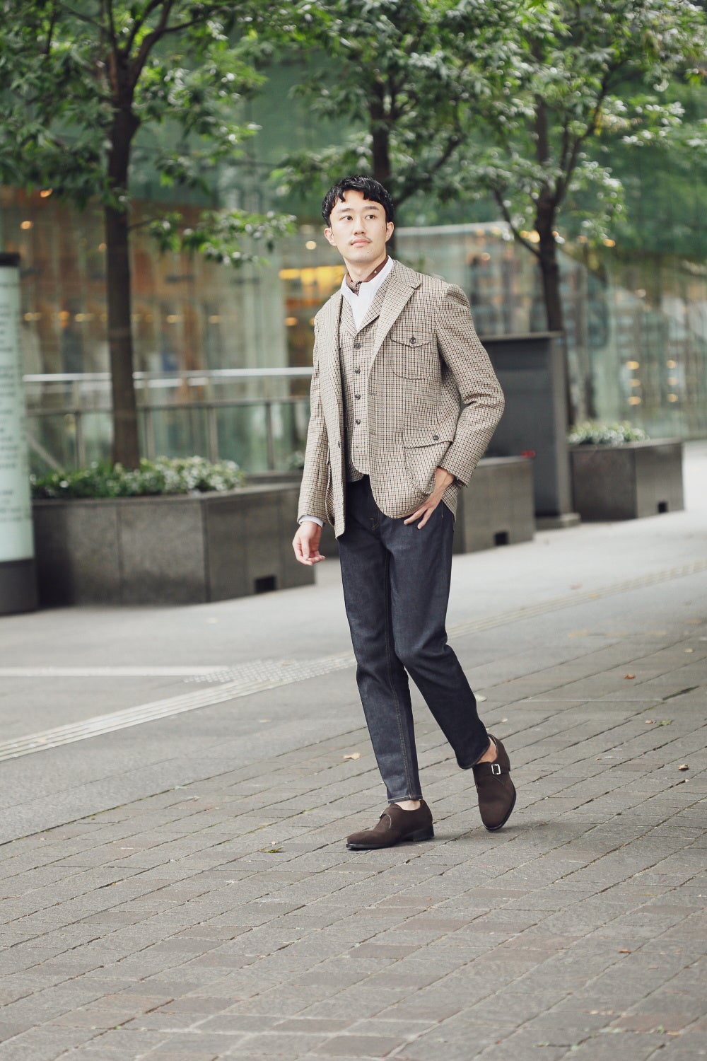 クラシカルな雰囲気のガンクラブチェック柄ジャケットと同素材のハンティングベストには、英国「THOMAS MASON」の生地を使用したプレミアムオックスフォードシャツをチョイス。デニム合わせでカジュアル感がありながらも、全体の色味と相まってシックな印象です。首元にブラウンのスカーフを取り入れれば、こなれた印象も簡単に演出できます。