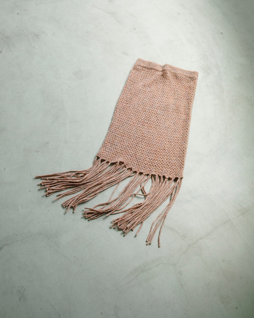 ウール混のミックス糸を使用した柔らかなニュアンスのある色味のスカート。今回のPOPUP限定カラーのサーモンは、落ち着きのある柔らかいカラーが◎裾の長めのフリンジが特徴的で、動きのあるデザインに仕上げています。メッシュニット地が抜け感たっぷりで冬のレイヤードスタイルに重宝すること間違いなし。