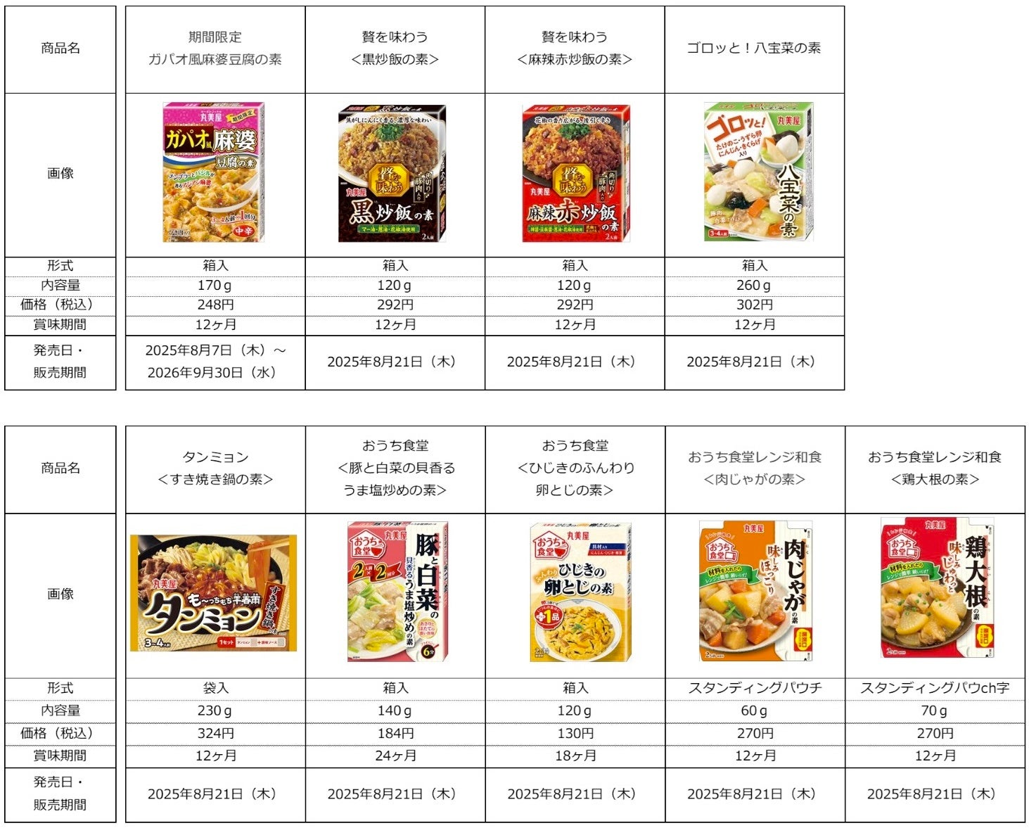 丸美屋食品工業株式会社(本社:東京都杉並区、社長:阿部豊太郎)は、手軽でおいしい毎日を応援する「メニュー用調味料」の新商品を2025年8月7日(木)と8月21日(木)に発売いたします。