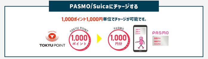 貯まったTOKYU POINTを1ポイント=1円として、PASMOもしくはSuicaに券売機等でチャージしてご利用いただけます。