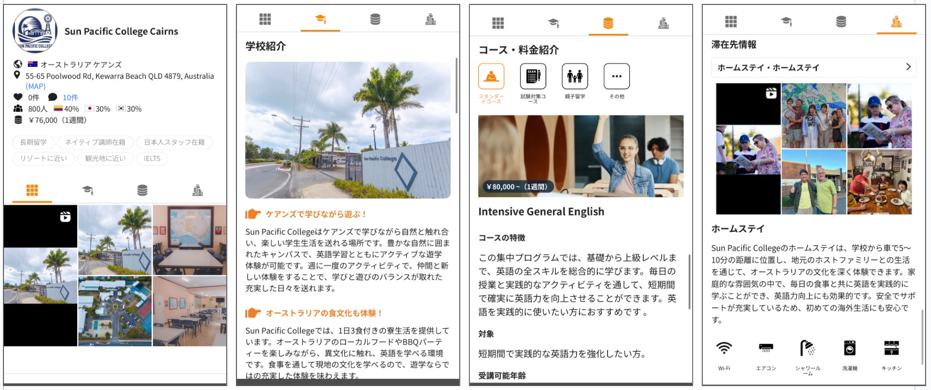 ネイティブキャンプ留学では、ユーザーが必要な情報を分かりやすく把握できるよう、常に丁寧で明確な情報提供を心がけています。Sun Pacific College Cairnsの詳細情報は、以下の4つのカテゴリーに分けて掲載しており、知りたい情報を的確にお届けします。