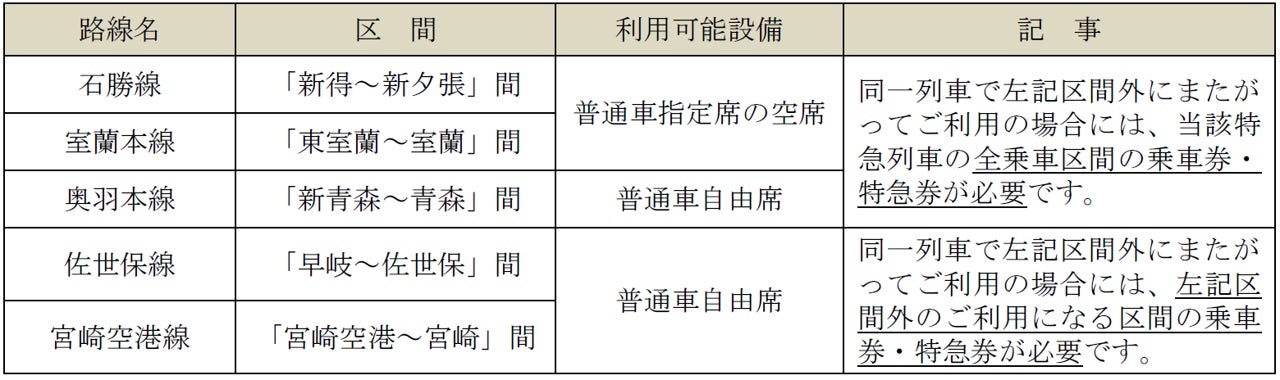 ◆以下の区間については、特例として特急列車の普通車自由席等がご利用いただけます。