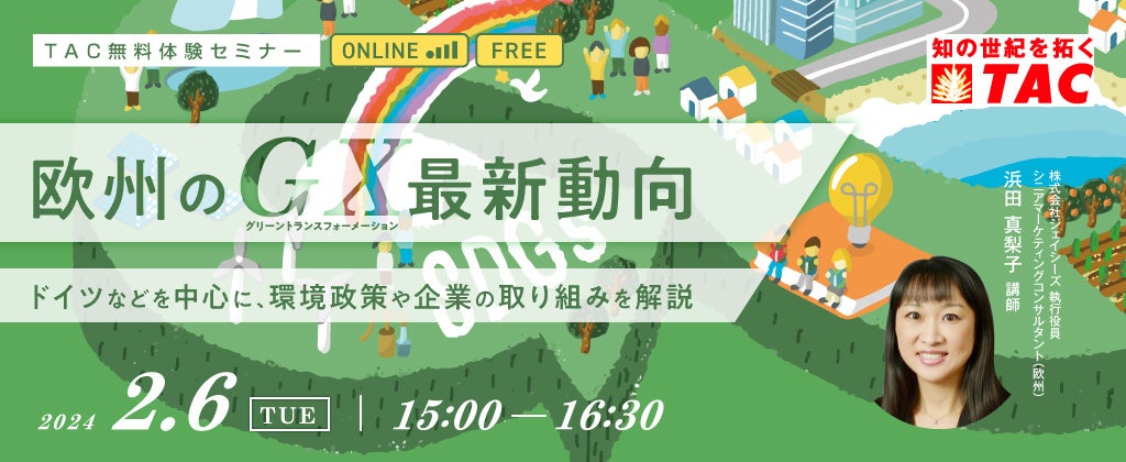 公認会計士や税理士など、多くの国家資格や検定試験の受験指導などの教育事業を展開しているTAC株式会社(東京都千代田区、代表取締役:多田敏男)は、法人向け人材教育部門から、世界各国で進められる脱炭素社会の実現について、欧州地域の環境政策や企業の取り組みを解説するセミナーを2024年2月6日(火)に実施します。