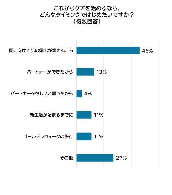 今後体毛ケアを始めるタイミングについては、「夏に向けて肌の露出が増える頃」が46%で最も多い結果になりました。次いで、パートナーの存在を意識してケアを始める人が17%(パートナーができたから13%と、パートナーをほしいと思ったから4%の合計)となりました。